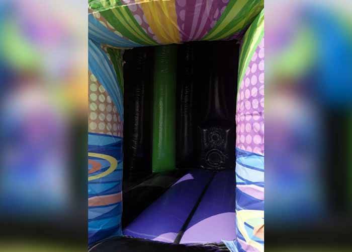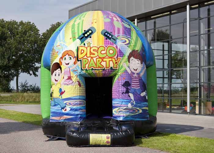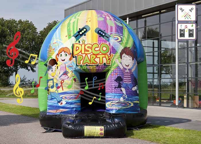 Diskoteks-hoppeborg med indbygget musikanlæg & discolys. Hoppeborgen er i professionel kvalitet, og leveres inklusiv blæser.