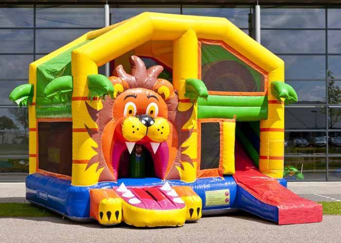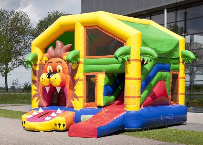 MultiPlay hoppeborg med populært Løve-tema inkl. pop-ups & indbygget rutschebane. Hoppeborgen er i professionel kvalitet, og leveres inklusiv blæser.
